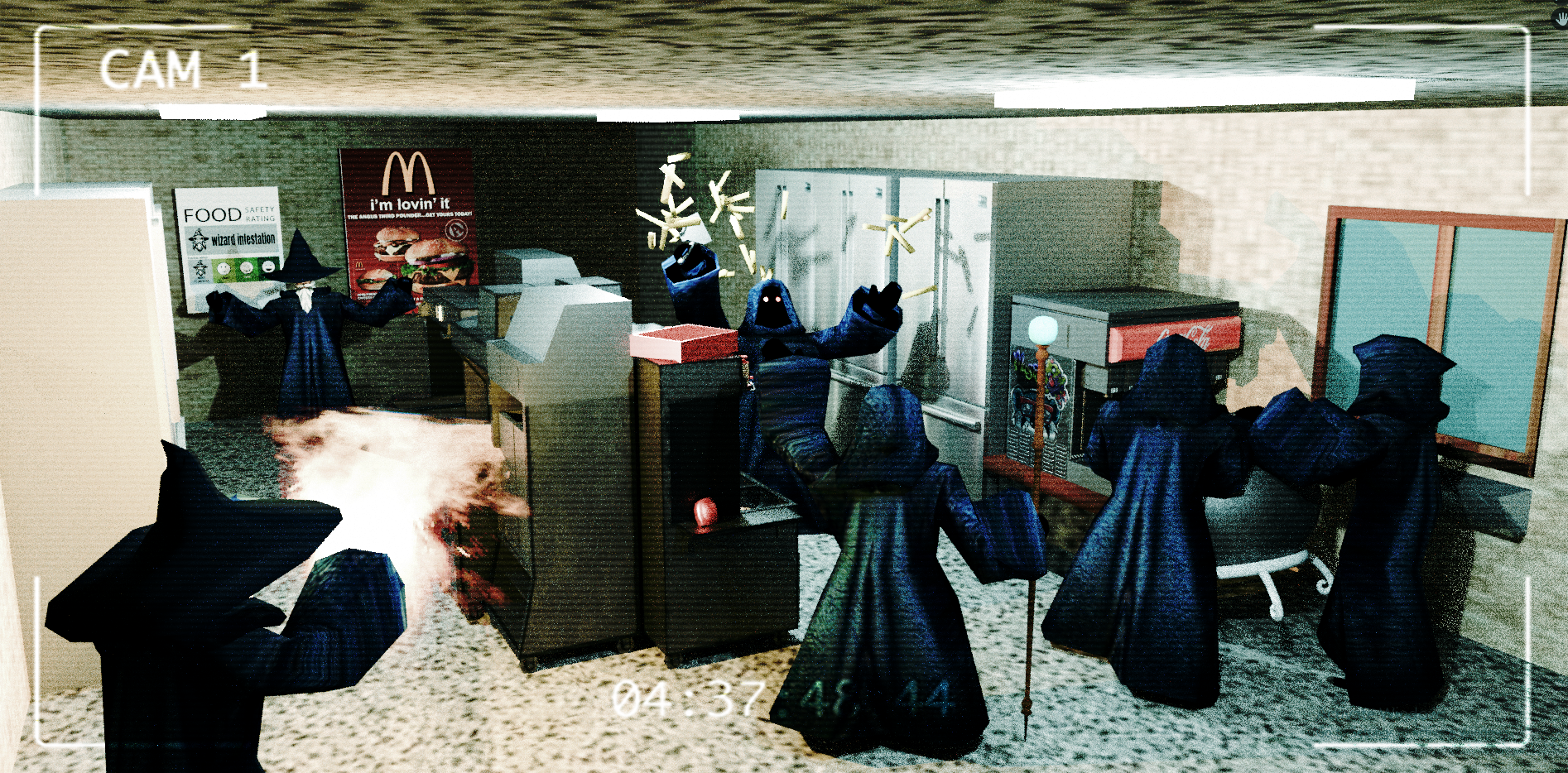......Oh sorry, you wanted a better explanation? Okay, Wizards breaking into McDonald's at night is actually a sommentary on the state of our economic problems and the conspiracy against the American dream and everythi-